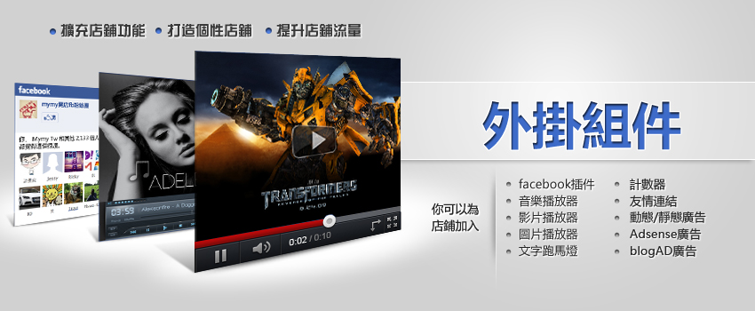 1.擴充店鋪功能 利用外掛組件,嵌入如[網站流量統計]、[跑馬公告欄]功能組件,讓mymy店鋪無所不能。